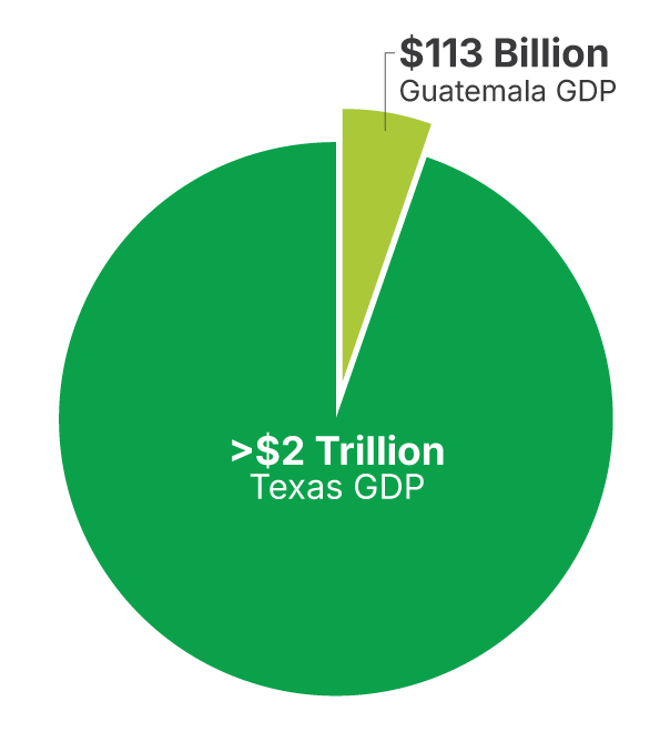 Guatemala’s gross domestic product (GDP) was $113 billion in 2024 (compared to a GDP in Texas of over $2 trillion).